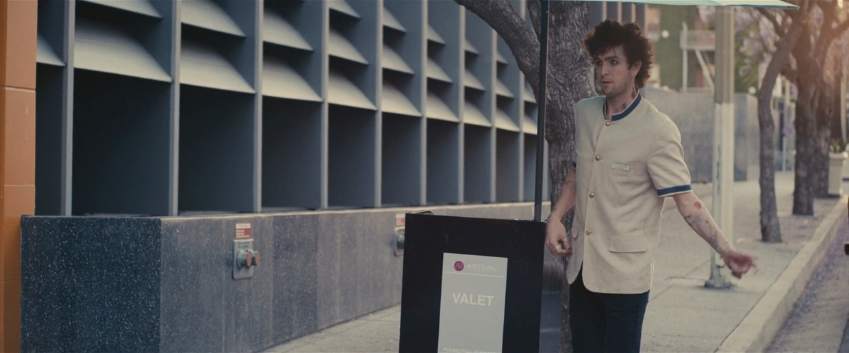 His appearance clashes heavily with his uniform as a humble valet parking employee, implying he only took the job in order to give his demo to someone important or just out of pure necessity (or maybe both).